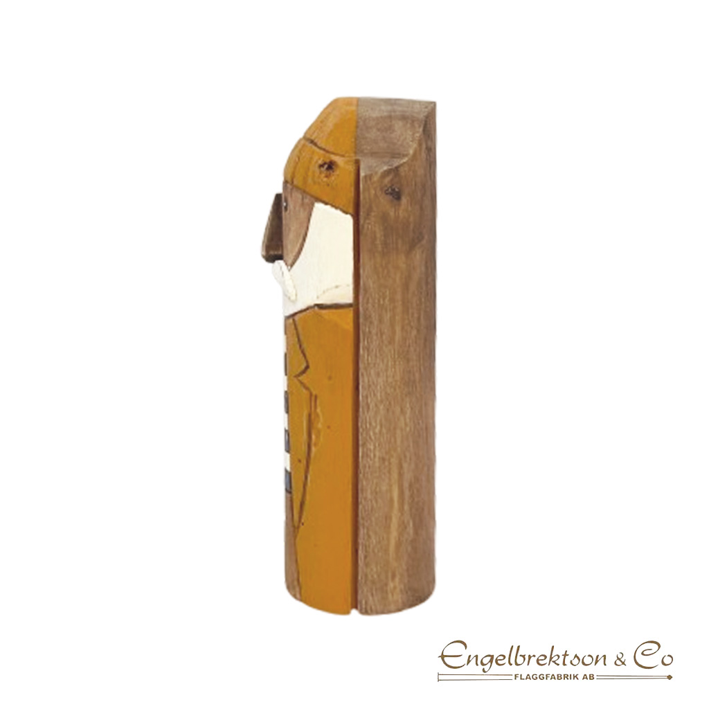 Fiskargubbe Figure is a carved wooden figure painted in a marine style with a yellow raincoat, striped sweater and hat.