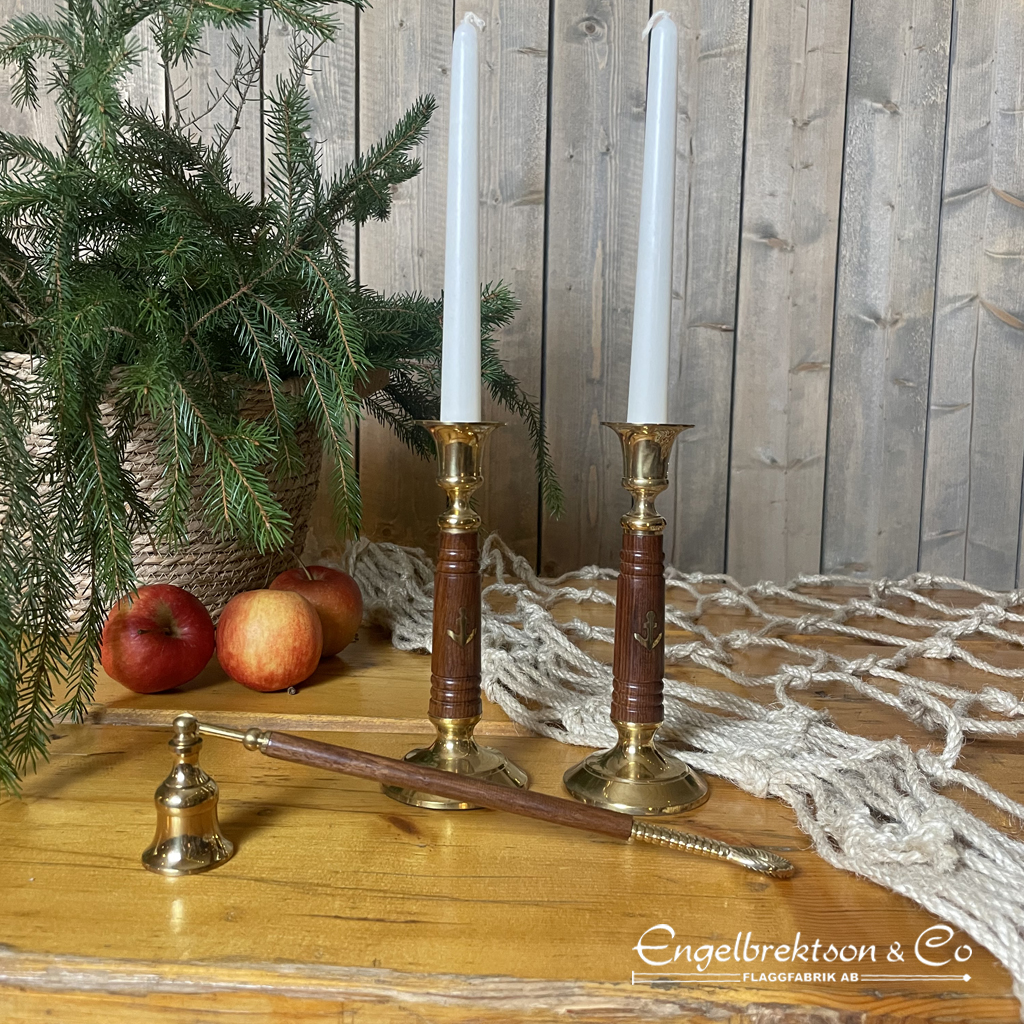 Candlestick made of wood and brass with anchor motif.