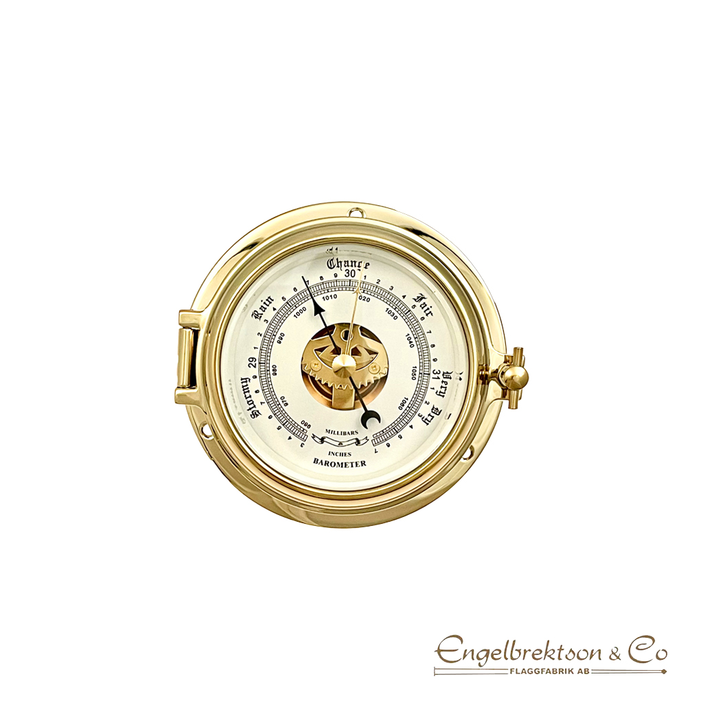 Detaljerad urtavla som visar lufttryck i både millibar och inches samt väderindikationer gör den både informativ och dekorativ.