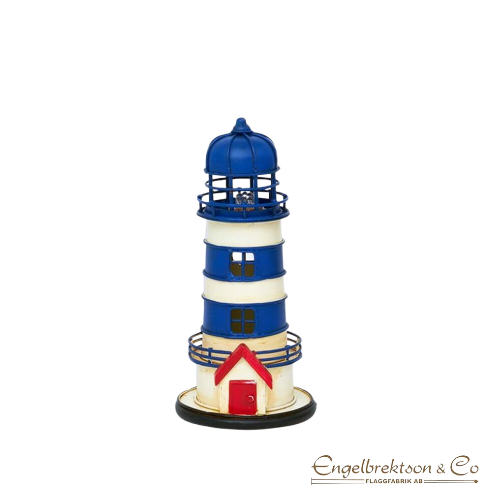 Våran minsta elfyr drivs på batteri. Fyren har tre vita fält och tre mörkblå där taket är mörkblått. Vid ingången på fyren finns en röd dörr med rött tak. Det finns flera mörkblå detaljer.