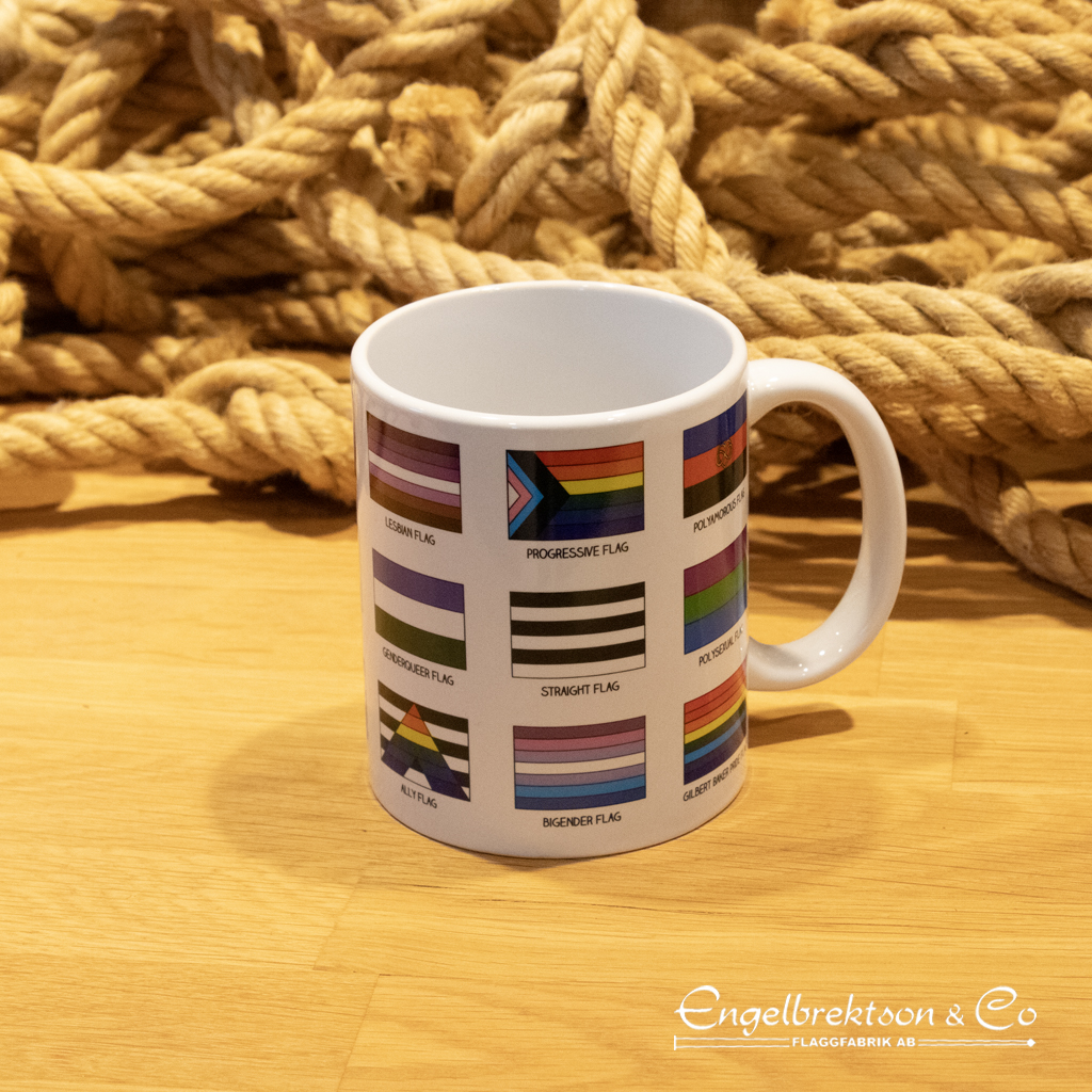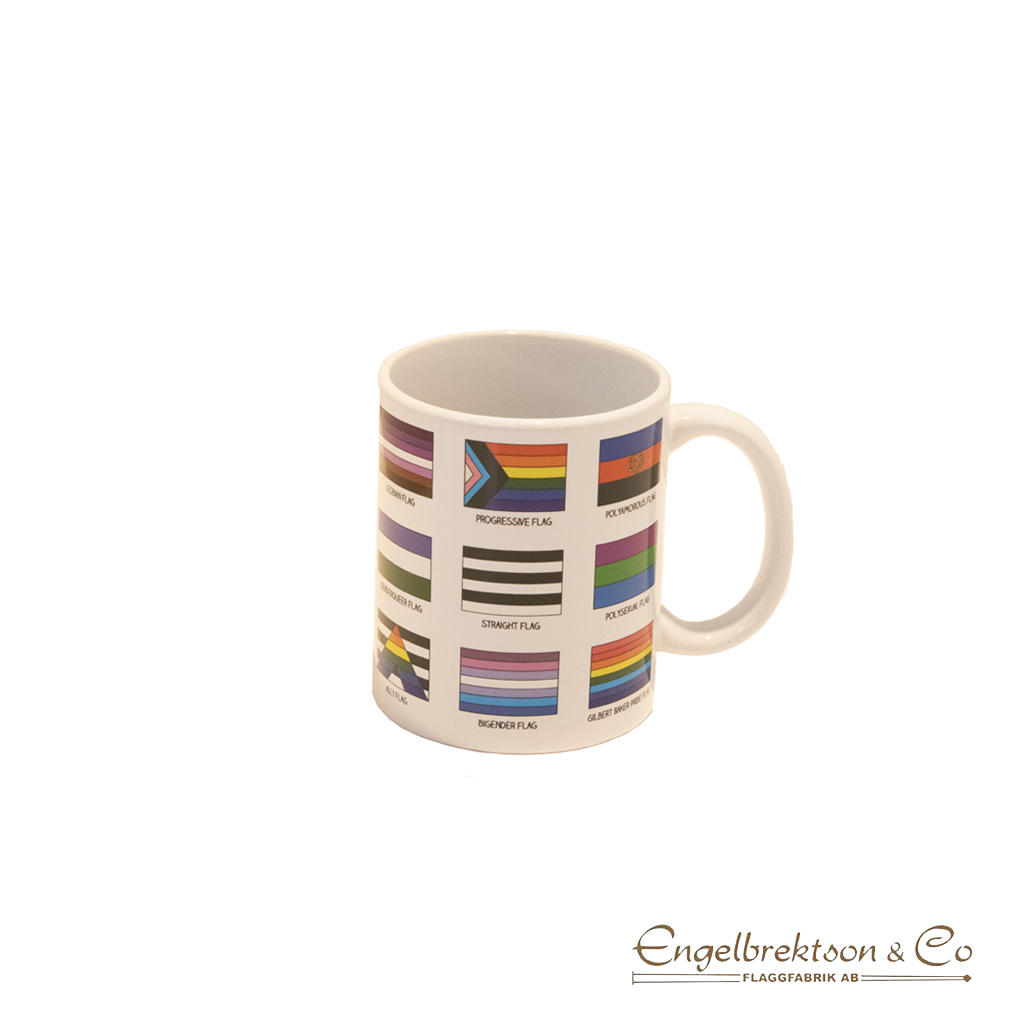 Runt om denna porslinsmugg finns en samling HBTQ+ motiv och deras betydelse. En garanterad konversationsstartare i fikarummet eller en härlig present.För te/kaffe eller andra varma drycker.