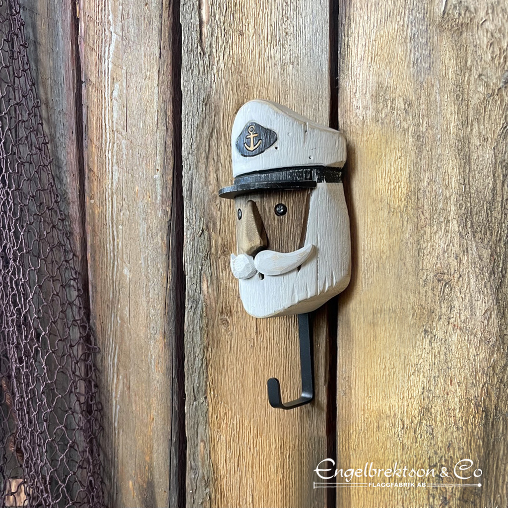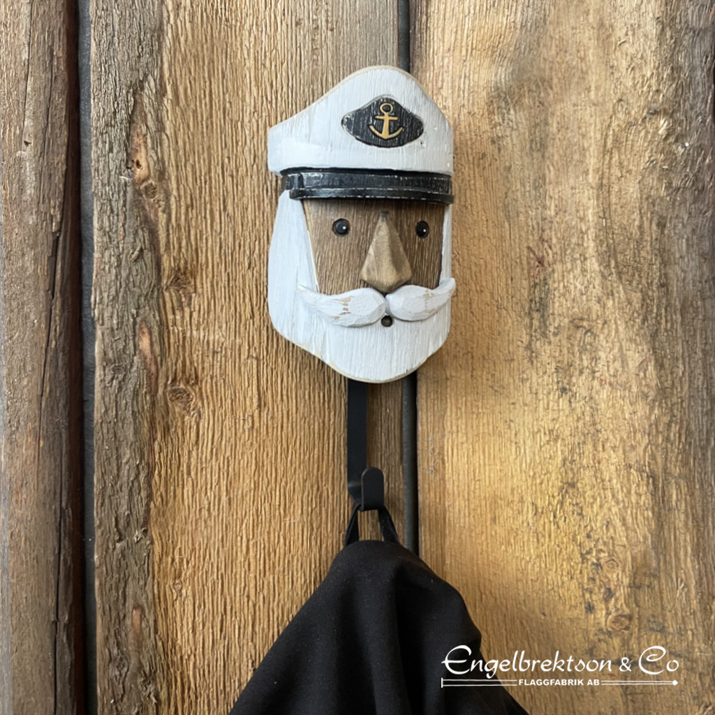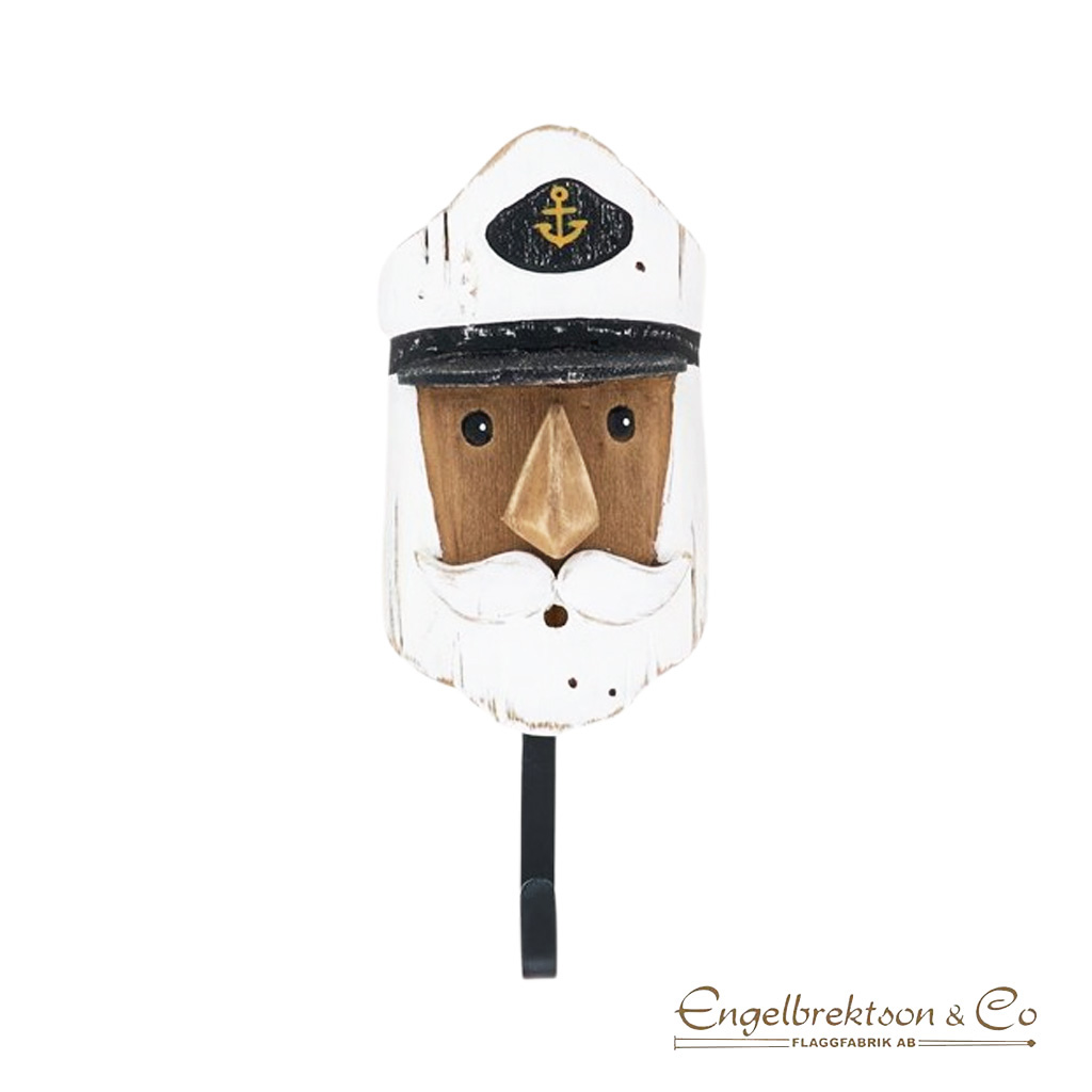 En krok med en kaptenskaraktär utsnidad av trä med en robust metallkrok undertill.Kaptensfiguren är målad med vitt skägg, vit hatt med svart skärm med ett gult ankare på framsidan.