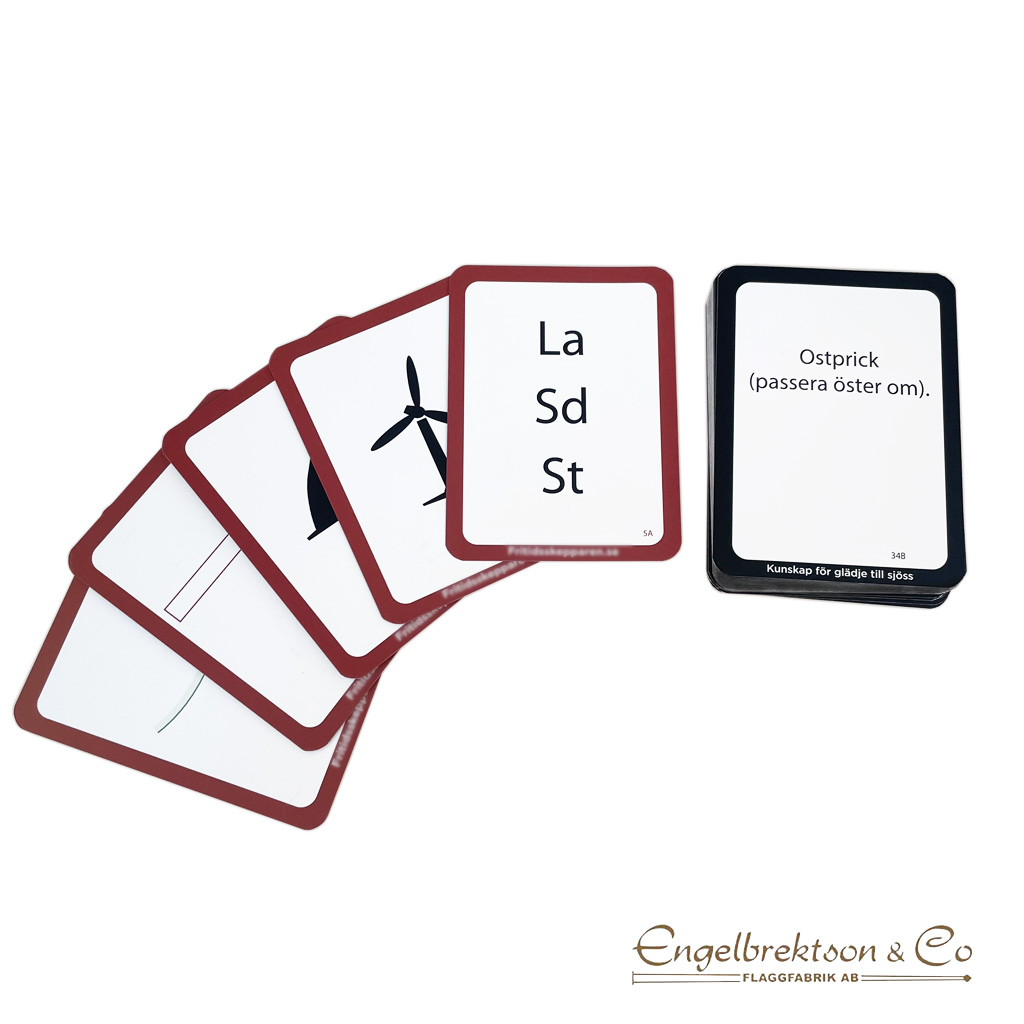 Detta kortspel innehåller 54 spelkort som visar de vanligaste svenska sjökortssymbolerna och beteckningarna. Svaret finns på baksidan.En kul present eller trevligt tidsfördriv på kvällen för den sjöintresserade. Funkar enskilt eller tillsammans med andra.