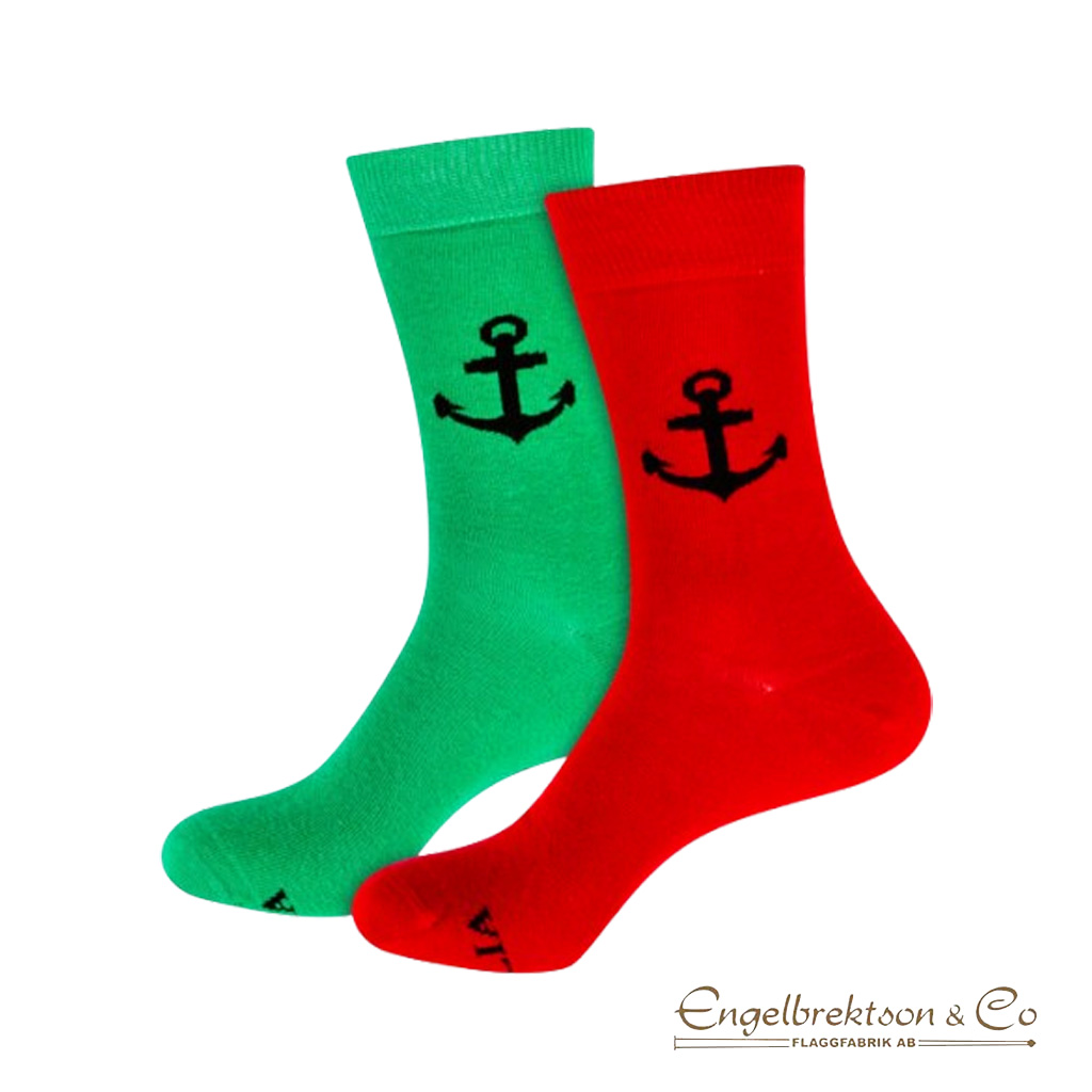Dessa praktiska strumpor hjälper dig att navigera rätt. En röd och en grön strumpa med ett svart ankare på utsidan.
